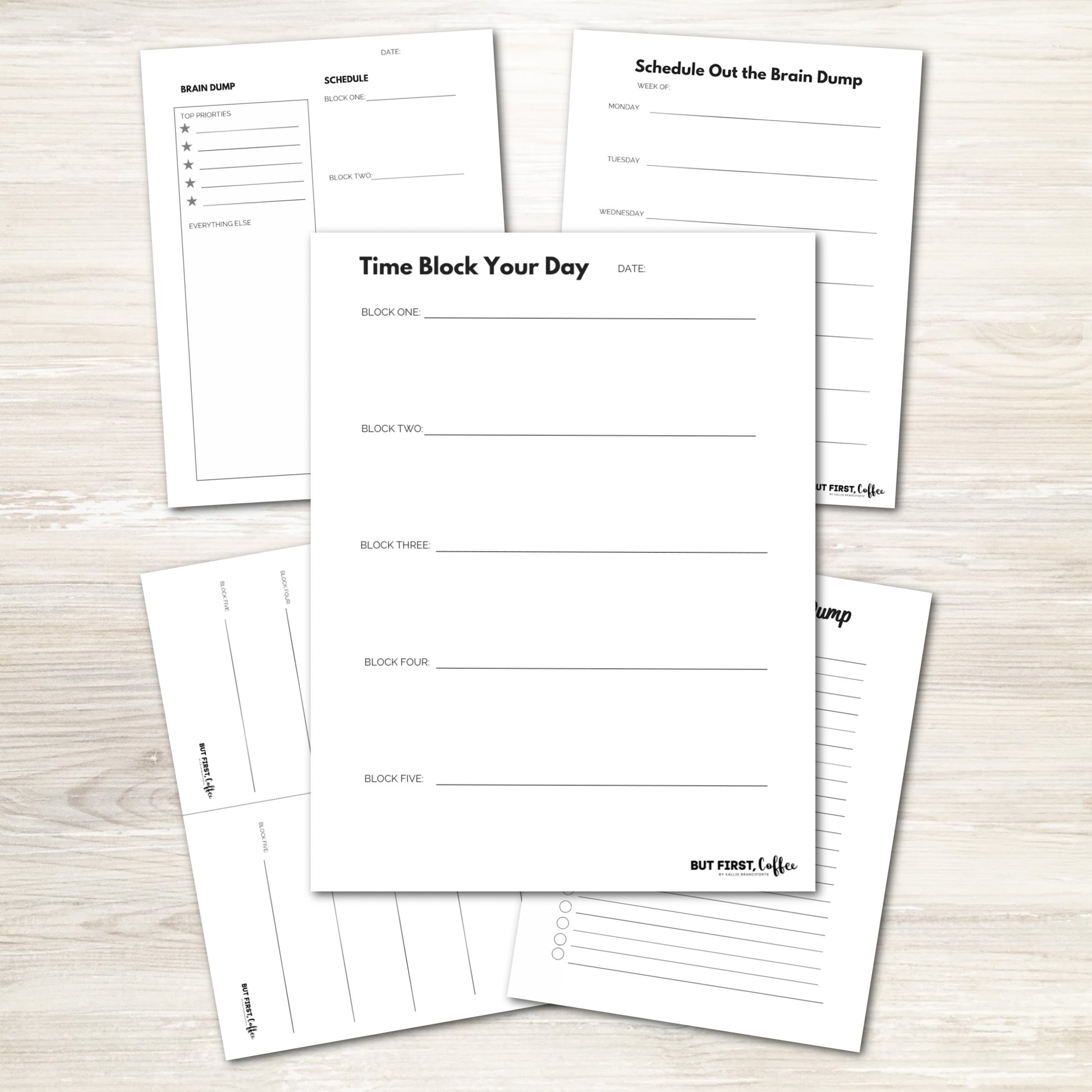 - Time-blocking planner customizable to your schedule (full and half sheets)
